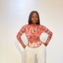 The Christy top is a printed mesh top, it features a fitted silhouette with long sleeves and a high neckline that contrasts beautifully with the sculpted bow detail across the bust